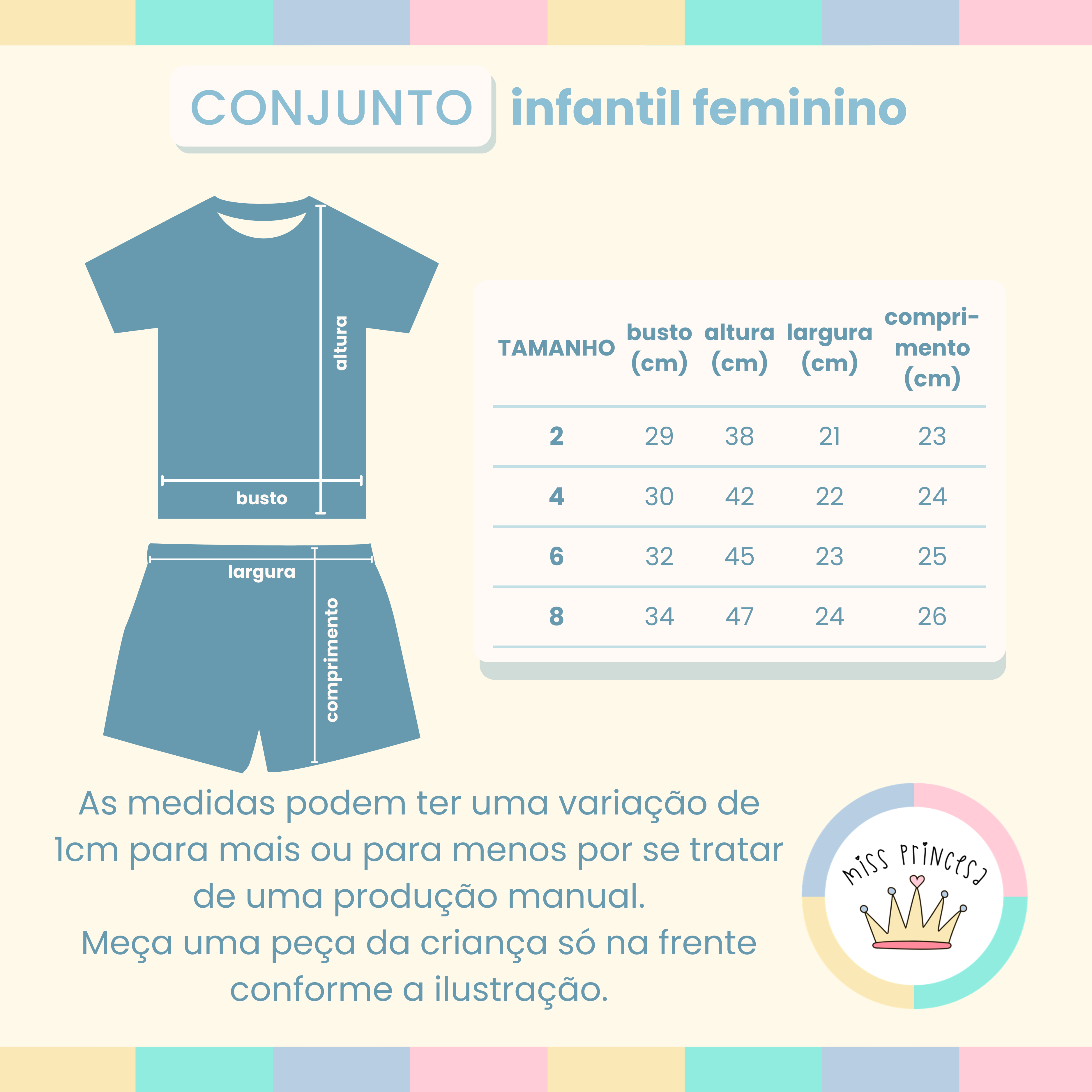 Confeccionado em tecido cotton, super macio, confortável e com ótimo caimento para o dia a dia. Possui estampa com aplique em DTF, garantindo cores vivas, durabilidade e um acabamento impecável. É aquele conjunto prático, estiloso e versátil, perfeito para compor looks cheios de charme.